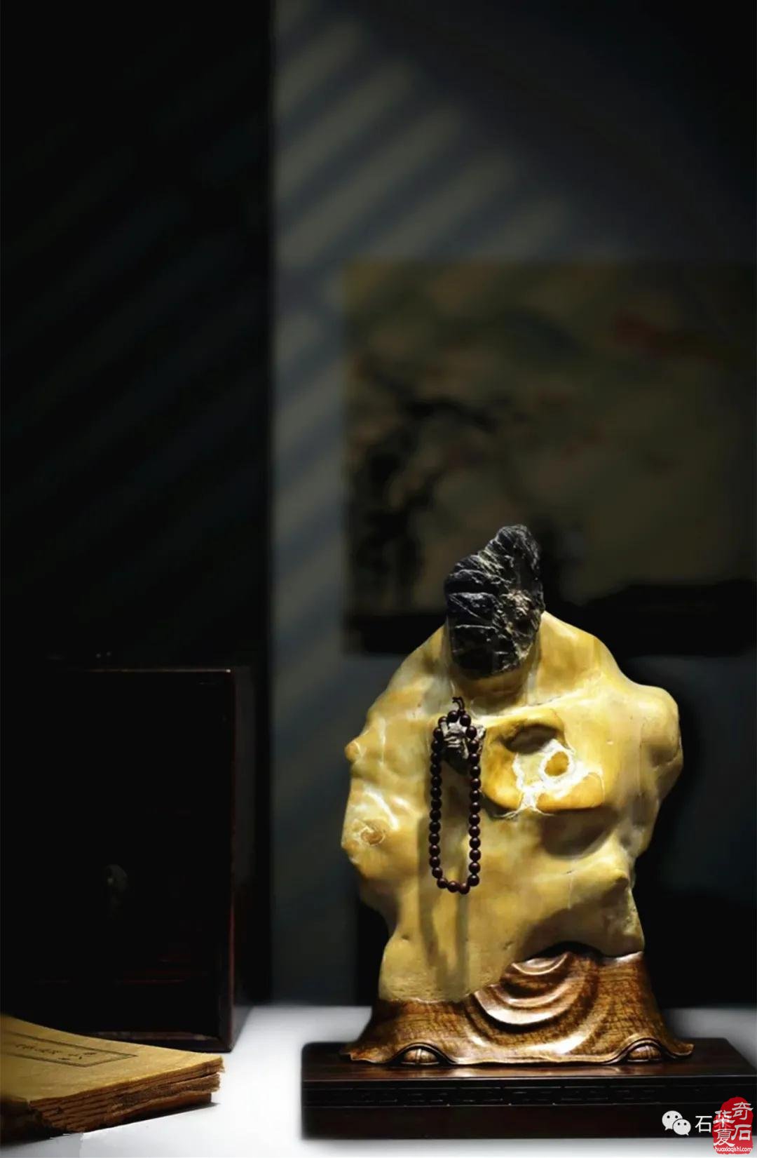便向人间觅是非。 这方灵璧石为一鲜明的人物形象,巧妙的是,身着黄袍,头面部俏色,一手置于胸前,似乎念念有词,满满虔诚。神态安详,显然心中充满虔诚信念才能如此从容虔肃。 鲜明的人物形象且性别角色也十分鲜明,为女性,黄袍加身,富贵无以复加,非太皇太后莫属。