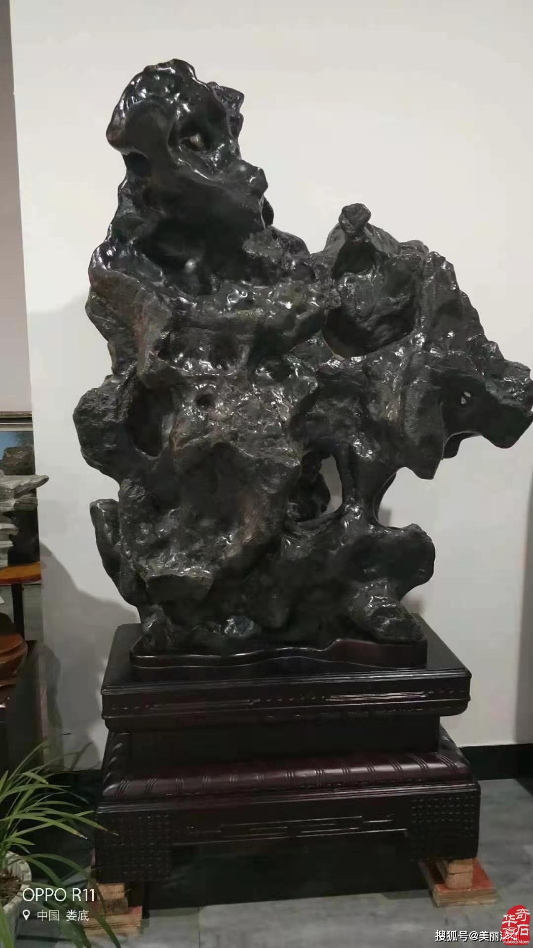 瑞华阁奇石艺术馆藏石——《蚩尤王》,重1.2吨,高1.98米。蚩尤在,梅⼭安。梅⼭⽂化之元祖,啸聚一方之豪杰,果敢、⽆畏、正义、进取的蚩尤。⽂化精义和梅山精神在⼀方奇⽯上表现得淋漓尽致。这⽅伟岸之物,苍然雄奇,沉厚叠壮。看蚩尤双⽬如矩,跨坐瑞兽麒麟之上,⼿擒其⽿,此一刻搏缚之势,如苍⻰卷云,猛虎奔岗,是那么胸有成⽵,势在必得,栩栩如⽣。据说蚩尤⼈身⽜蹄,四眼六手,兽身人语,⾮常奇异。而此奇⽯上端四孔,正如蚩尤四眼,造物天然。且⾊泽黝⿊幽润,光线、纹理、明暗,层次微妙,如松篁迎风,苍烟落照。退而远观,若隐若现间,仿佛⼜能遥⻅群峰绵渺,万壑逶迤,将⾃己放置期间,便与梅山相⽣相融。天画神镂之巧!⽯中奇物,莫过如此。
