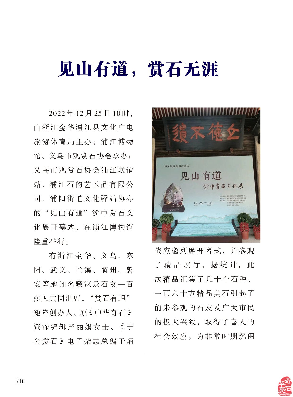 时间:2023-02-08 来源:华夏奇石网 作者:阿 文 点击数:编者按:面对极其特殊的疫情环境,于公赏石人克服困难,2023年首期《于公赏石》电子版杂志提前上线与广大读者见面啦!为新春佳节增添了浓浓的喜庆,献上了暖暖的厚重的祝福!她以极大的包容、涵盖、接纳了石界的各种声音,讲述石界审美趣味的变化,内容丰富,信息量大。《于公赏石》独辟蹊径,推陈出新,口碑不错的电子版杂志,反响良好。《于公赏石》是我国著名赏石家、词作家于炳战(网名于公)先生创办的电子版刊物。于公之赏石,情真意切、神与物游,填词作賦、格调高雅,开赏石诗文之新风,独树一帜,开辟了石界赏石文化之先河,为推动和弘扬赏石文化他不遗余力,辛勤耕耘,为我们赏石人提供了一个全新的视角,全新的阅读方式,广大石友读者也有了更多的选择。寒冬料峭也能让石友们在足不出户的情况下了解外面的世界,掌握石界的动态。我们将《于公赏石》2023年第首期的内容分批陆续刊登,与读者分享,分享新春赏石的快乐。