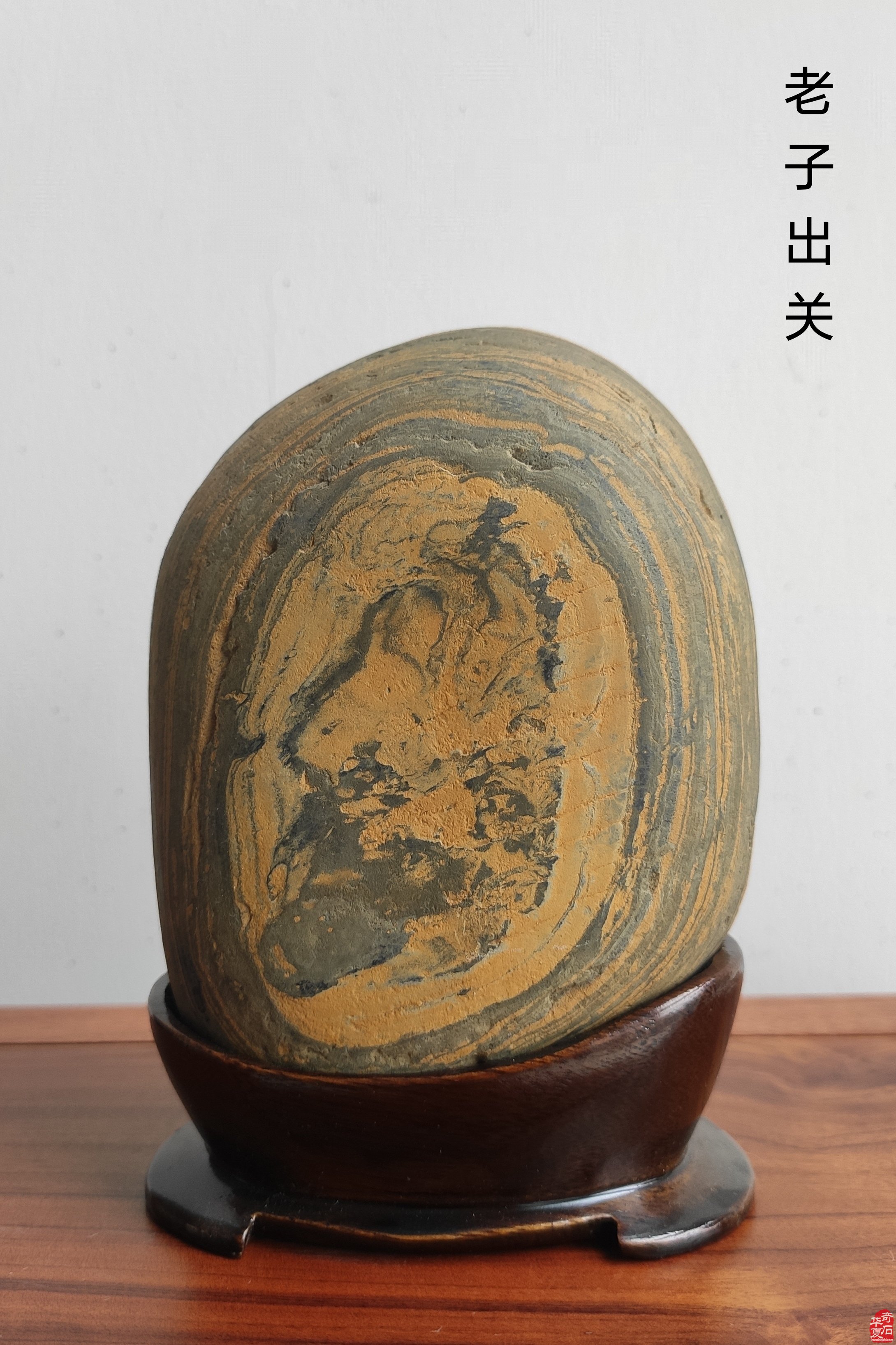 在赏石界,以《老子出关》命名的石头也颇受赏玩者青睐。这里为大家奉出一方长江黄金水墨小品石,这不是人们常说一眼石,初看不明主题,细看品味无穷。画面上部似一老者,道髻高挽、宽额高眉、鹤发银髯,身形侧坐,恬淡从容,稳如山岳,形象透着一股仙风道骨之气。画面左下似一牵牛执蹬童子,五官清秀,兴致高昂。那通灵的青牛则有节奏地踏步缓行。