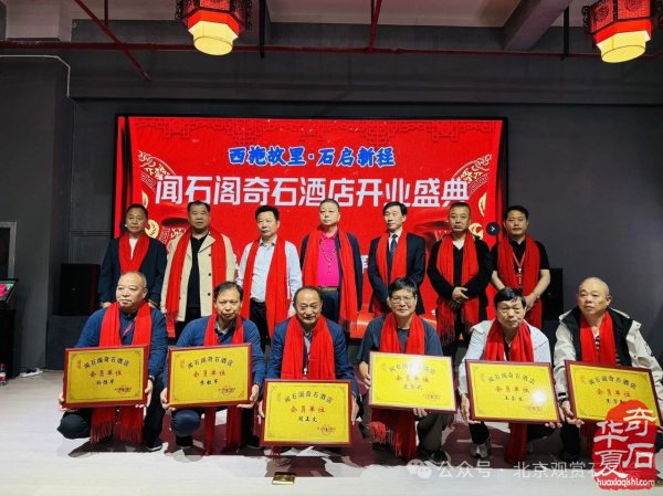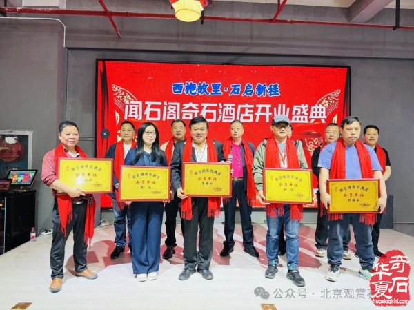 由闻石阁奇石酒店高级顾问何宝宽、张建升、张建宇、马金悦、张琼虎、景男、温德坤、刘英祥、汤辉、王贵民为闻石阁奇石酒店全体会员单位授牌。